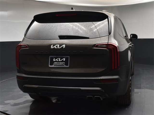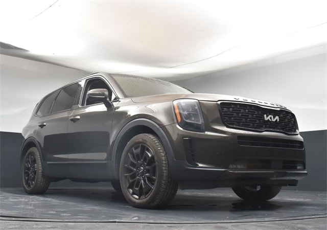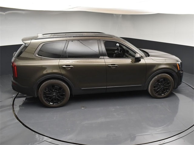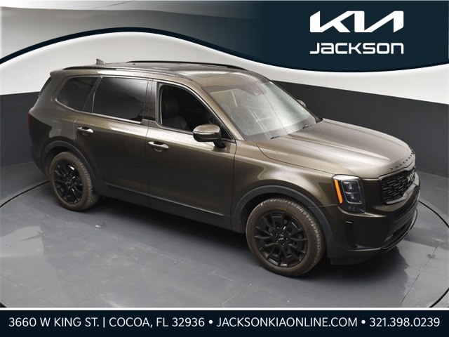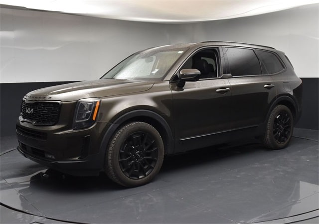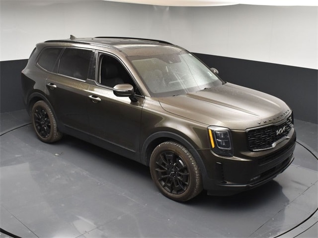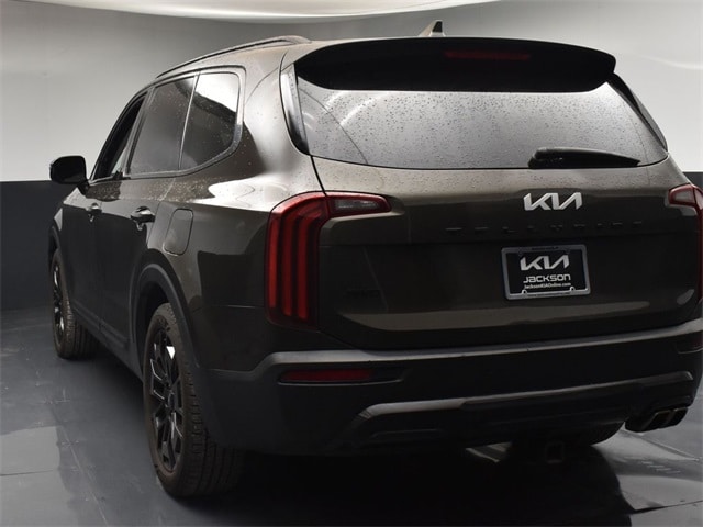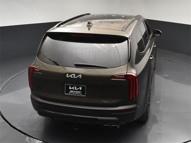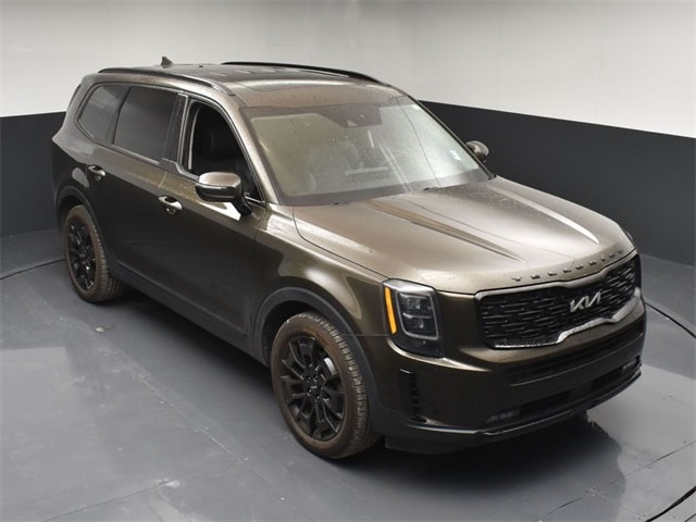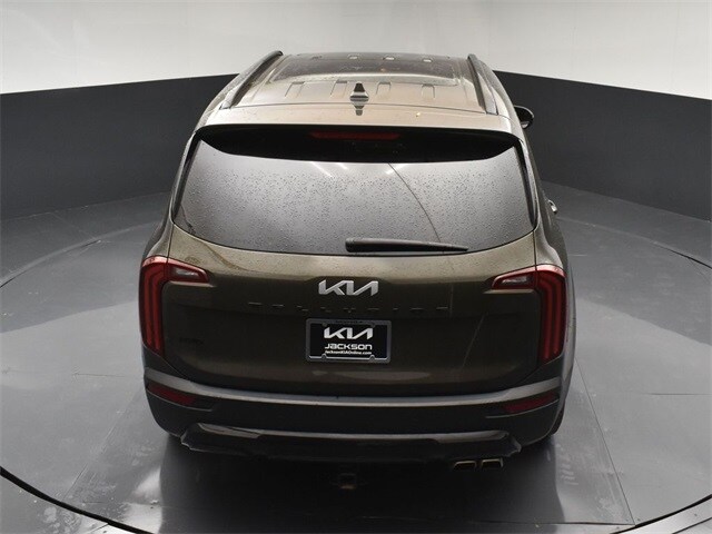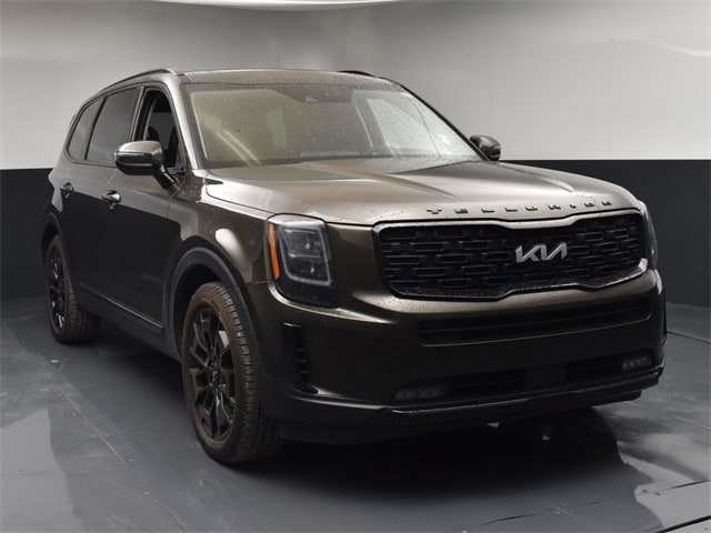 Certified. KIA CERTIFIED PRE-OWNED, 10 Speakers, 110V Inverter, 3.648 Axle Ratio, 3rd row seats: split-bench, 4-Wheel Disc Brakes, ABS brakes, Air Conditioning, Alloy wheels, AM/FM radio: SiriusXM, Apple CarPlay & Android Auto, Auto High-beam Headlights, Auto-dimming Rear-View mirror, Automatic temperature control, Black Finish Radiator Grille, Black Wheel Lock, Body Color Exterior Door Handles, Brake assist, Bumpers: body-color, Carpeted Floor Mats, Compass, Delay-off headlights, Driver door bin, Driver vanity mirror, Dual front impact airbags, Dual front side impact airbags, Electronic Stability Control, Emergency communication system: 911 Connect, Exclusive Black Fog Light Bezel, Exclusive Black Headlight Bezels, Four wheel independent suspension, Front & Rear Gloss Black Finish Bumper Skid Plates, Front anti-roll bar, Front Bucket Seats, Front Center Armrest, Front dual zone A/C, Front fog lights, Front reading lights, Fully automatic headlights, Garage door transmitter: HomeLink, Gloss Black Finish Exterior Emblems, Gloss Black Finish Front & Rear Door Garnish, Gloss Black Finish Roof Rails, harman/kardon® Speakers, Heads-Up Display, Heated & Ventilated 2nd Row Seats, Heated & Ventilated Front Bucket Seats, Heated door mirrors, Heated front seats, Heated steering wheel, Illuminated entry, Knee airbag, Leather Seat Trim, Leather Shift Knob, Leather steering wheel, Low tire pressure warning, Memory seat, Navigation System, Nightfall Edition Package, Occupant sensing airbag, Outside temperature display, Overhead airbag, Overhead console, Panic alarm, Passenger door bin, Passenger vanity mirror, Power door mirrors, Power driver seat, Power Liftgate, Power moonroof, Power passenger seat, Power steering, Power windows, Premium Cloth Headliner & Pillar Trim, Premium Nappa Leather Seat Trim, Radio data system, Radio: AM/FM harman/kardon Audio System, Rain-Sensing Front Windshield Wipers, Rear air conditioning, Rear anti-roll bar, Rear audio controls, Rear reading lights, Rear window defroster, Rear window wiper, Reclining 3rd row seat, Remote keyless entry, Roof rack: rails only, Security system, Smart Key w/ Push Button and Remote Start, Speed control, Speed-sensing steering, Split folding rear seat, Spoiler, Steering wheel mounted audio controls, SX Prestige Package, Tachometer, Telescoping steering wheel, Tilt steering wheel, Traction control, Trip computer, Turn signal indicator mirrors, Variably intermittent wipers, Ventilated front seats, Wheels: 20" x 7.5" Black Alloy, Wheels: 20" x 7.5" Exclusive Black Alloy. Jackson Advatange includes Lifetime Carwashes, Lifetime Loaner vehicle, Anti-Theft Window Etch, Dark Moss 2022 Kia Telluride SX AWD 8-Speed Automatic 3.8L V6 DOHC Kia Certified Pre-Owned Details: